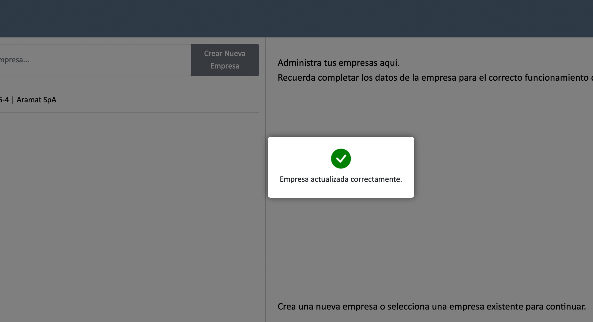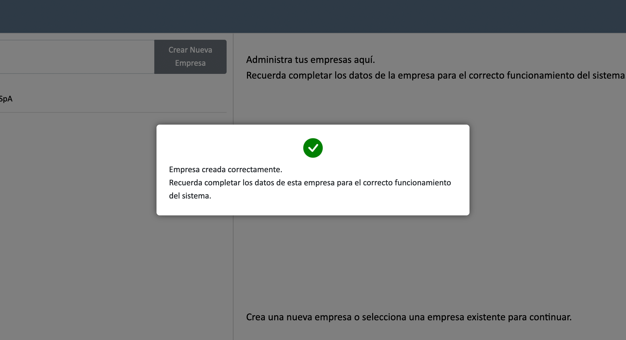 Confirmación de datos: Si los datos ingresados son correctos, el sistema mostrará un mensaje indicando que la empresa se ha creado exitosamente. También se te pedirá completar información adicional para optimizar el funcionamiento del sistema.
