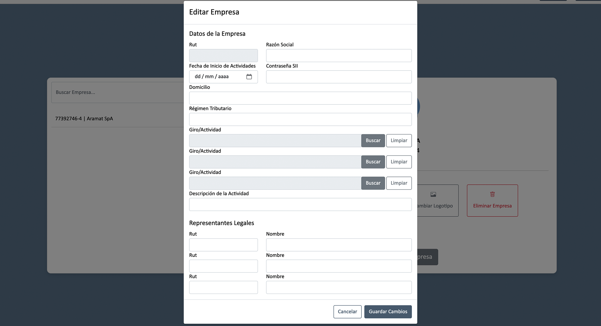 Modificar datos de la empresa: Llena o modifica todos los campos solicitados. Es fundamental ingresar la clave del SII (Servicio de Impuestos Internos), ya que esto permitirá al sistema conectarse automáticamente y descargar los libros de compras, ventas, retenciones, entre otros. Si la clave ha cambiado, ingresa la nueva información en el campo correspondiente.