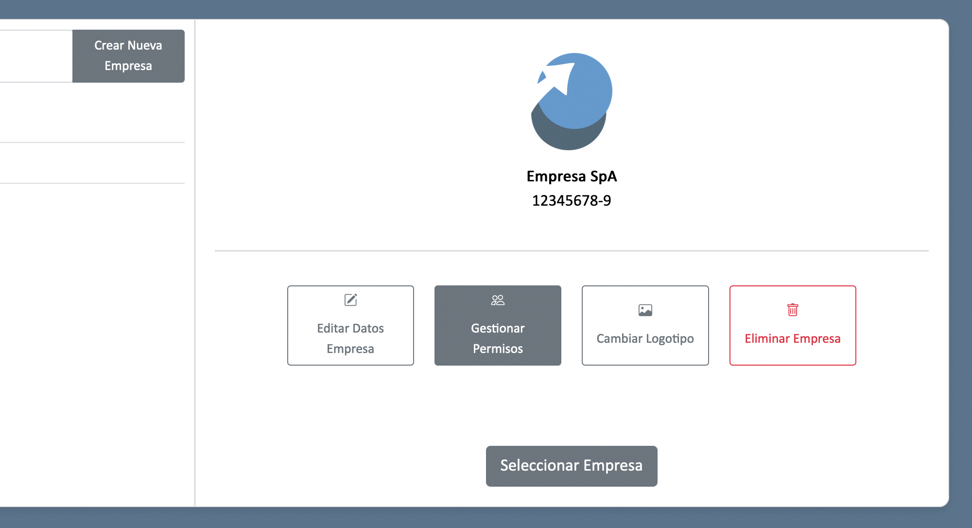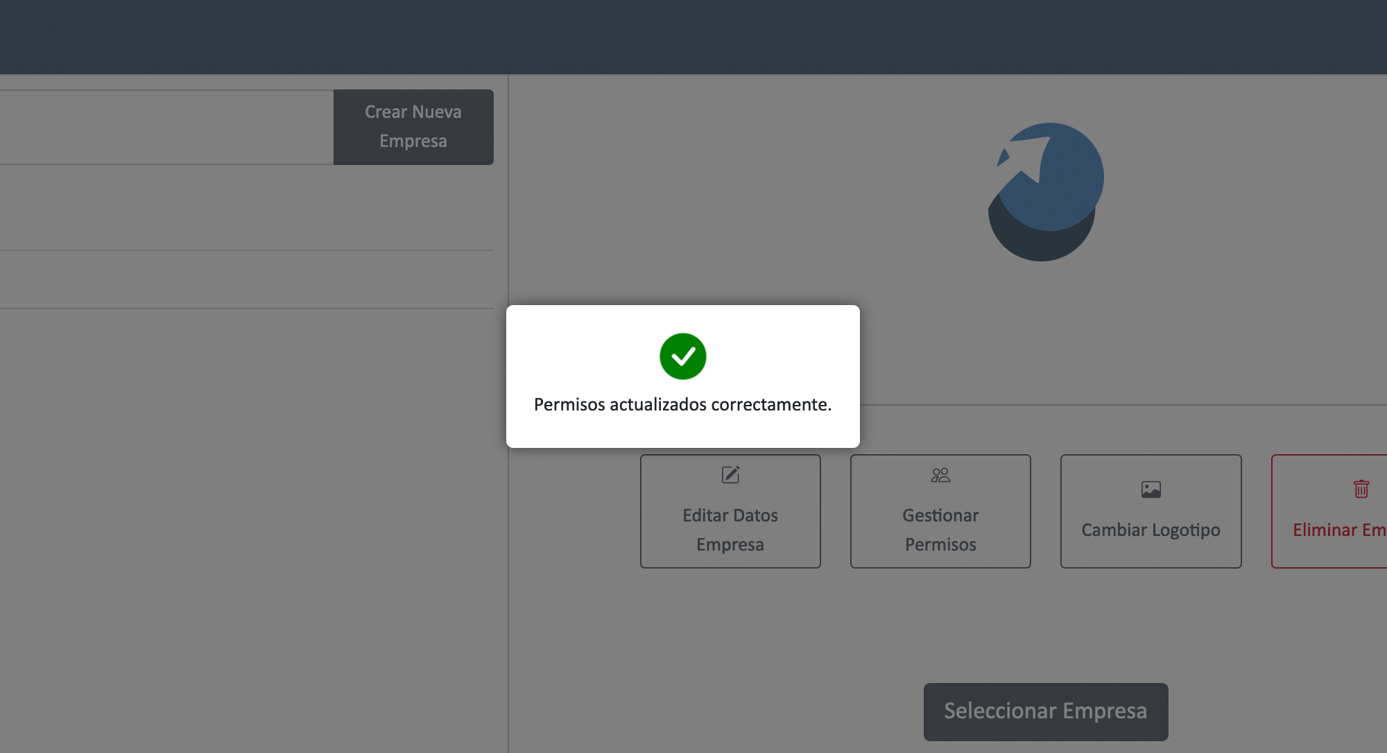 Iniciar la gestión de permisos: Una vez seleccionada la empresa, haz clic en el botón Gestionar Permisos. Esto abrirá una ventana flotante donde podrás visualizar y asignar los usuarios asociados.