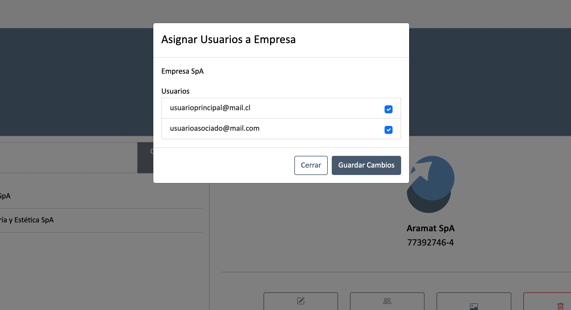 Asignar usuarios: En la ventana flotante, se desplegará un listado con todos los usuarios asociados a tu cuenta. Marca las casillas correspondientes a los usuarios que deseas asignar a la empresa seleccionada. Puedes elegir más de un usuario si es necesario.