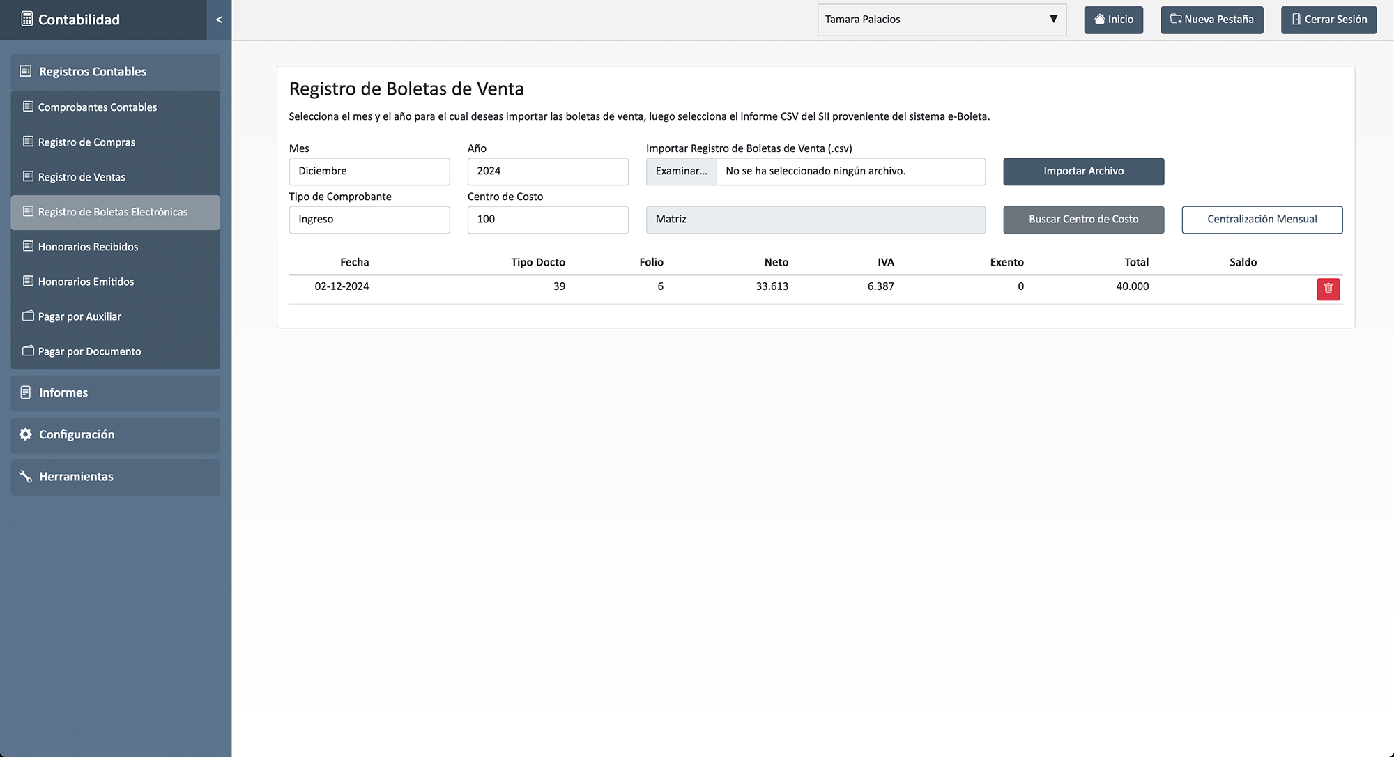 En esta sección, puedes importar tus boletas de ventas electrónicas dentro del sistema. Permite gestionar y contabilizar todas las transacciones relacionadas con las ventas realizadas con boletas de ventas electrónicas
