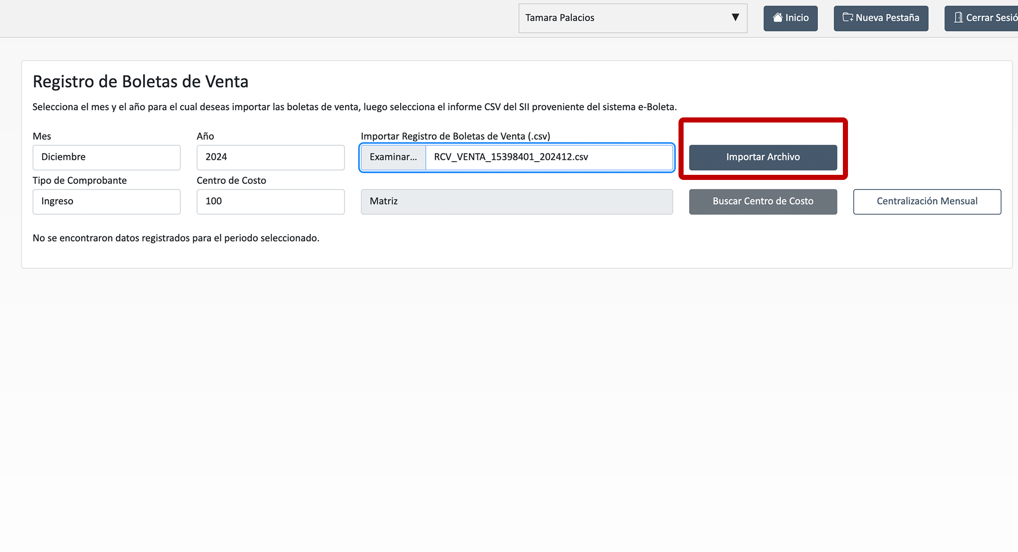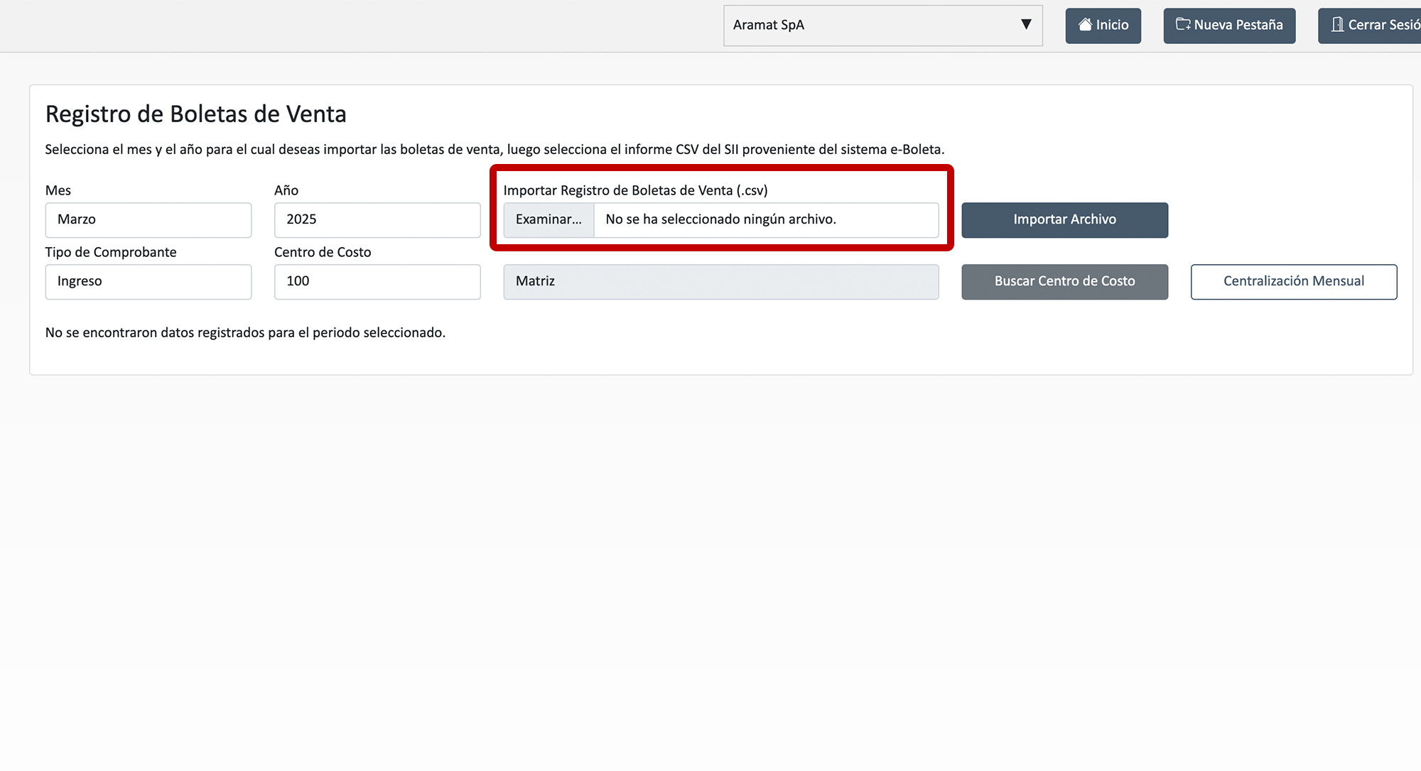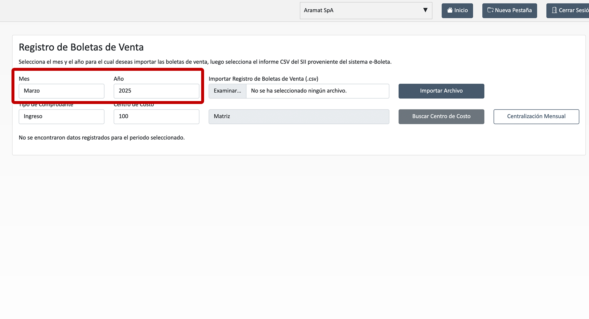 2- Ya en el sistema, selecciona el mes y el año para el cual deseas importar las boletas electrónicas de ventas