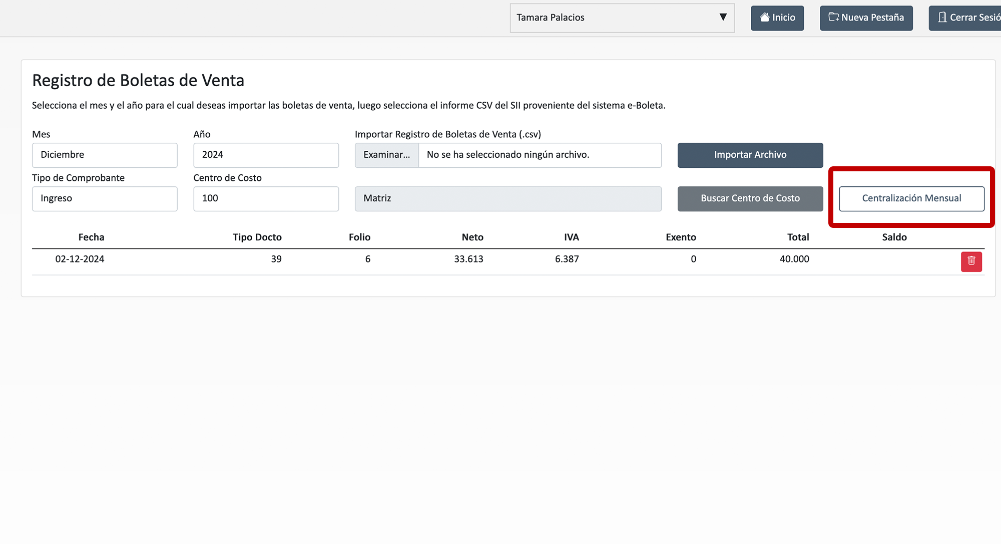 Centralizar información: Puede ser masivamente (total de la venta) o individualmente (una línea por boleta)