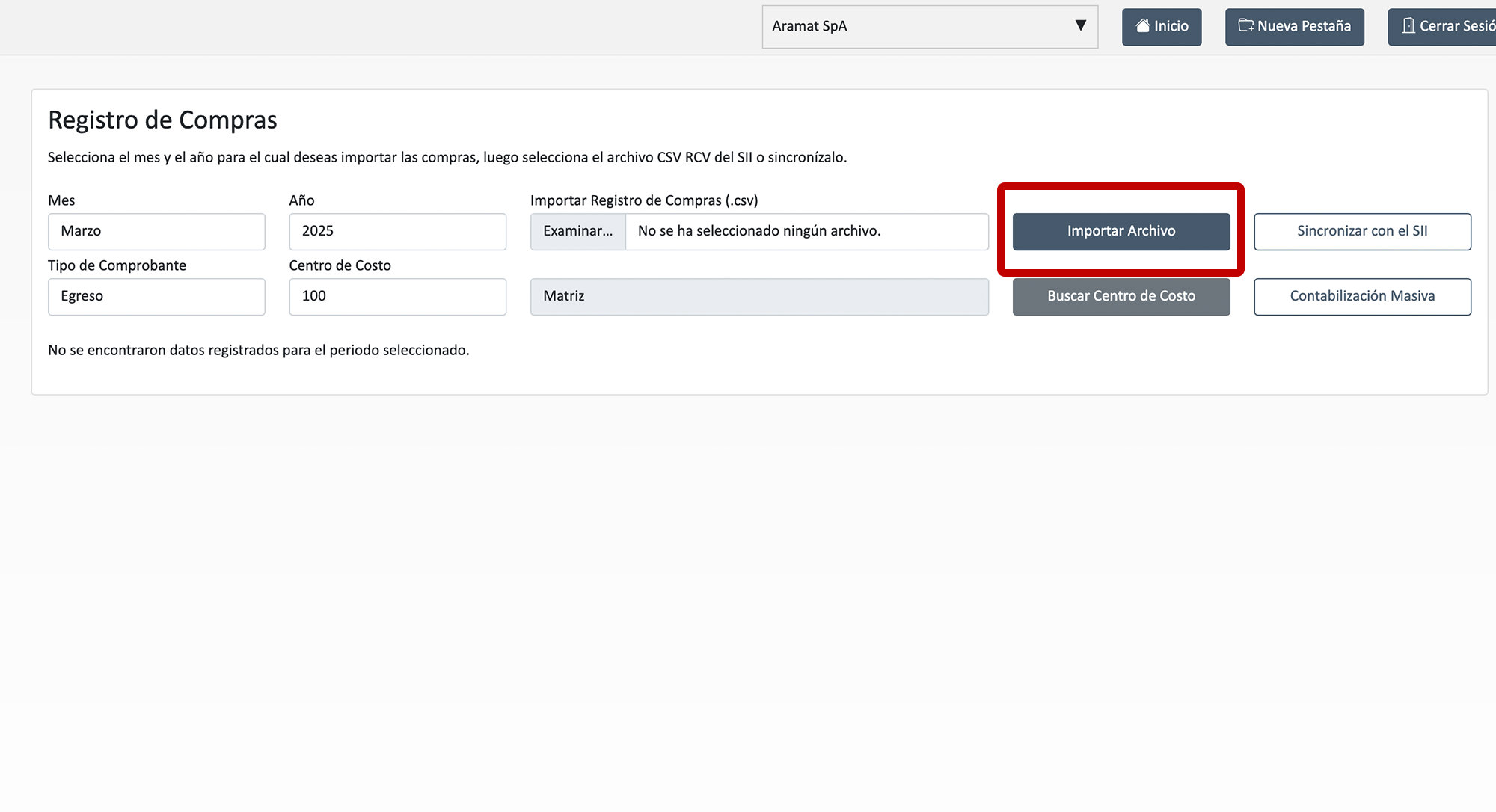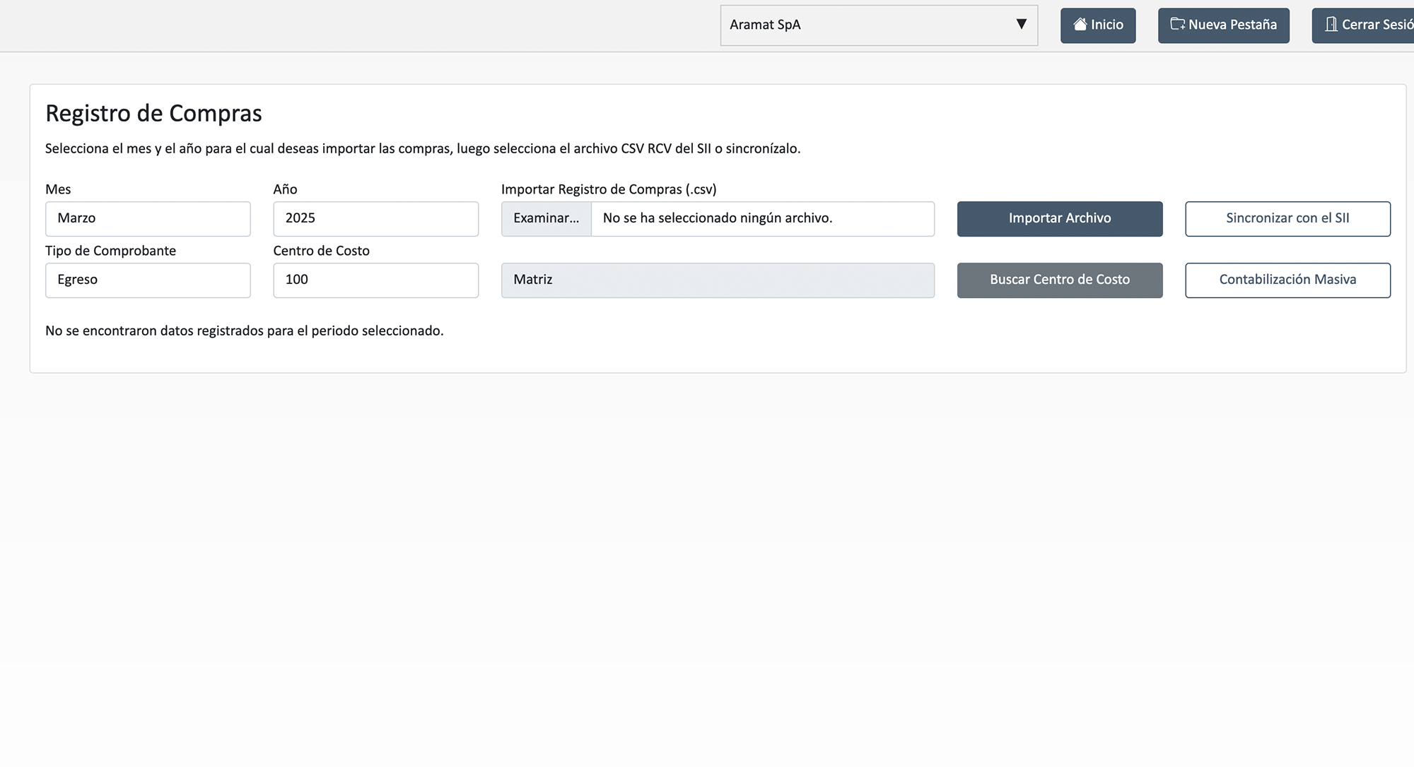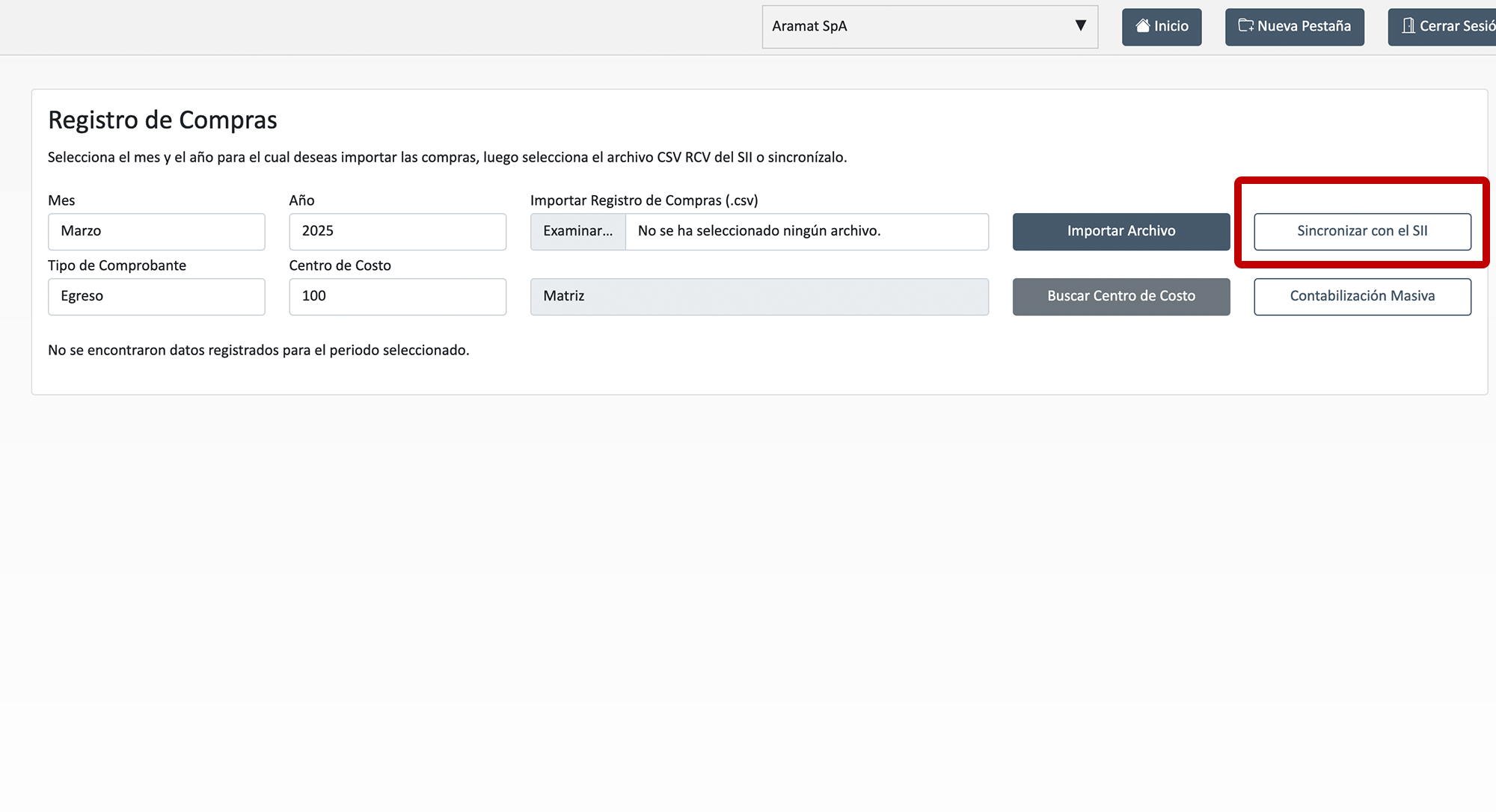 Importar registros: Importa información al sistema, ya sea a través de un archivo .csv descargado de SII o sincronizando directamente con SII.
