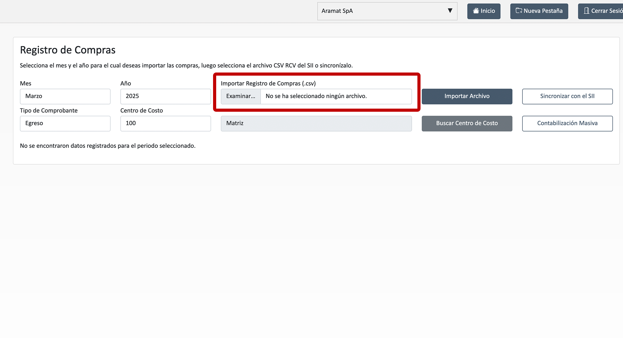 2- Selecciona el archivo CSV previamente descargado del Registro de Compras y Ventas de SII con el seleccionador de archivos.