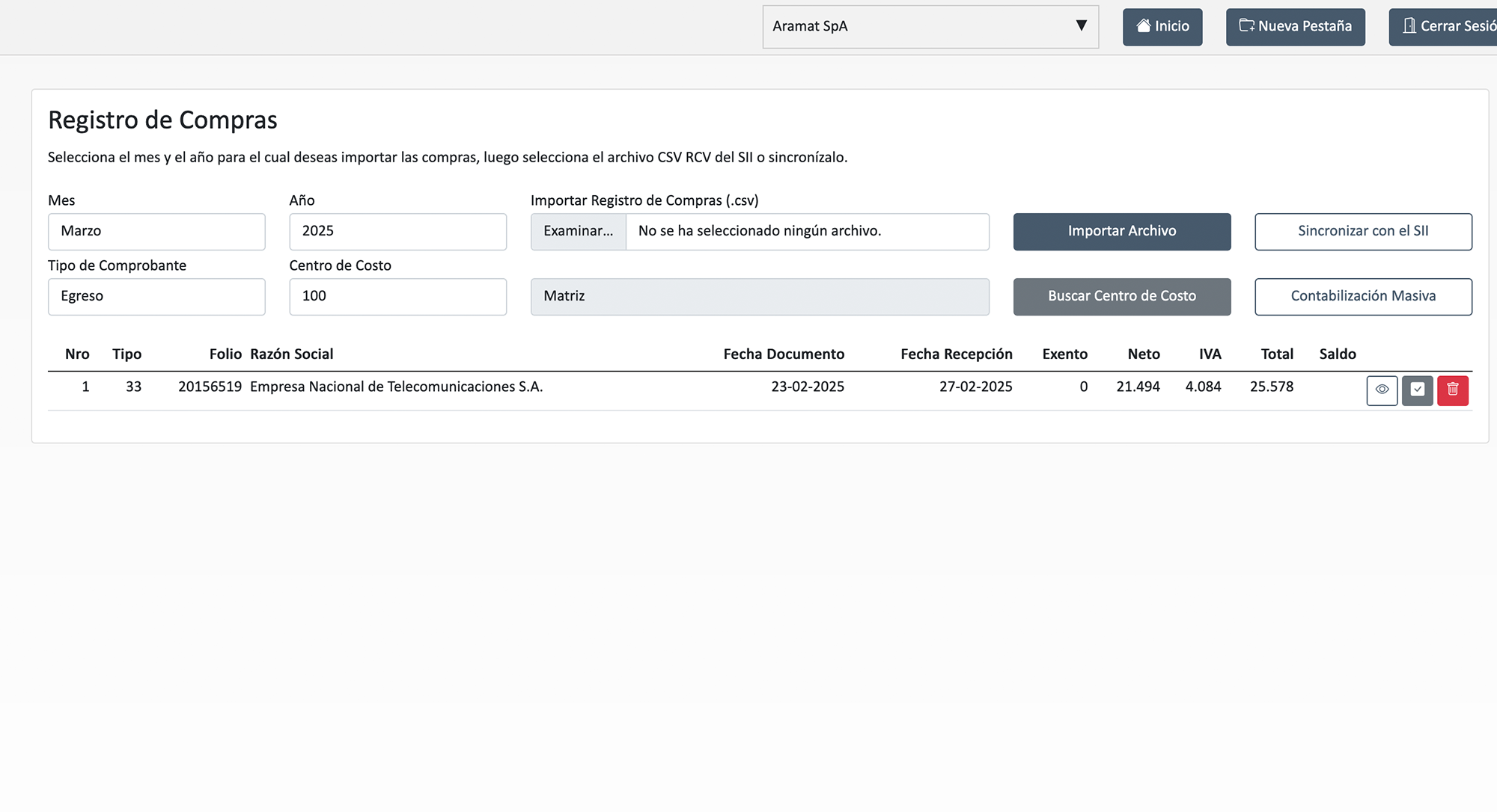 En esta sección, puedes ver, importar y/o sincronizar tus compras dentro del sistema. Permite gestionar y contabilizar todas las transacciones relacionadas con las compras.